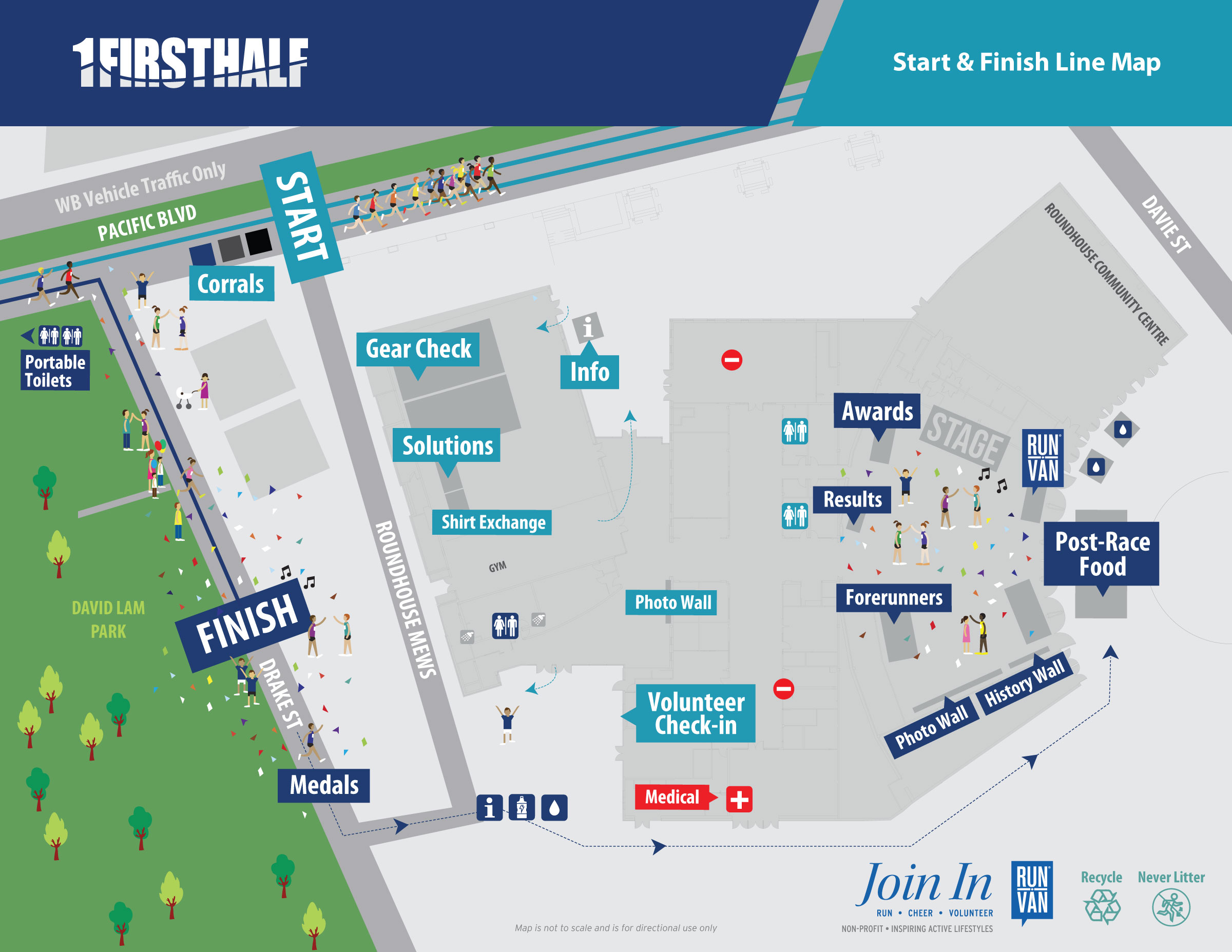 The First Half starts at 8:30am and finishes at 11:30am with approximately 2,500 runners expected out on the course. The race begins in front of the Roundhouse Community Centre on Pacific Boulevard between Davie and Drake Street at 8:30am.